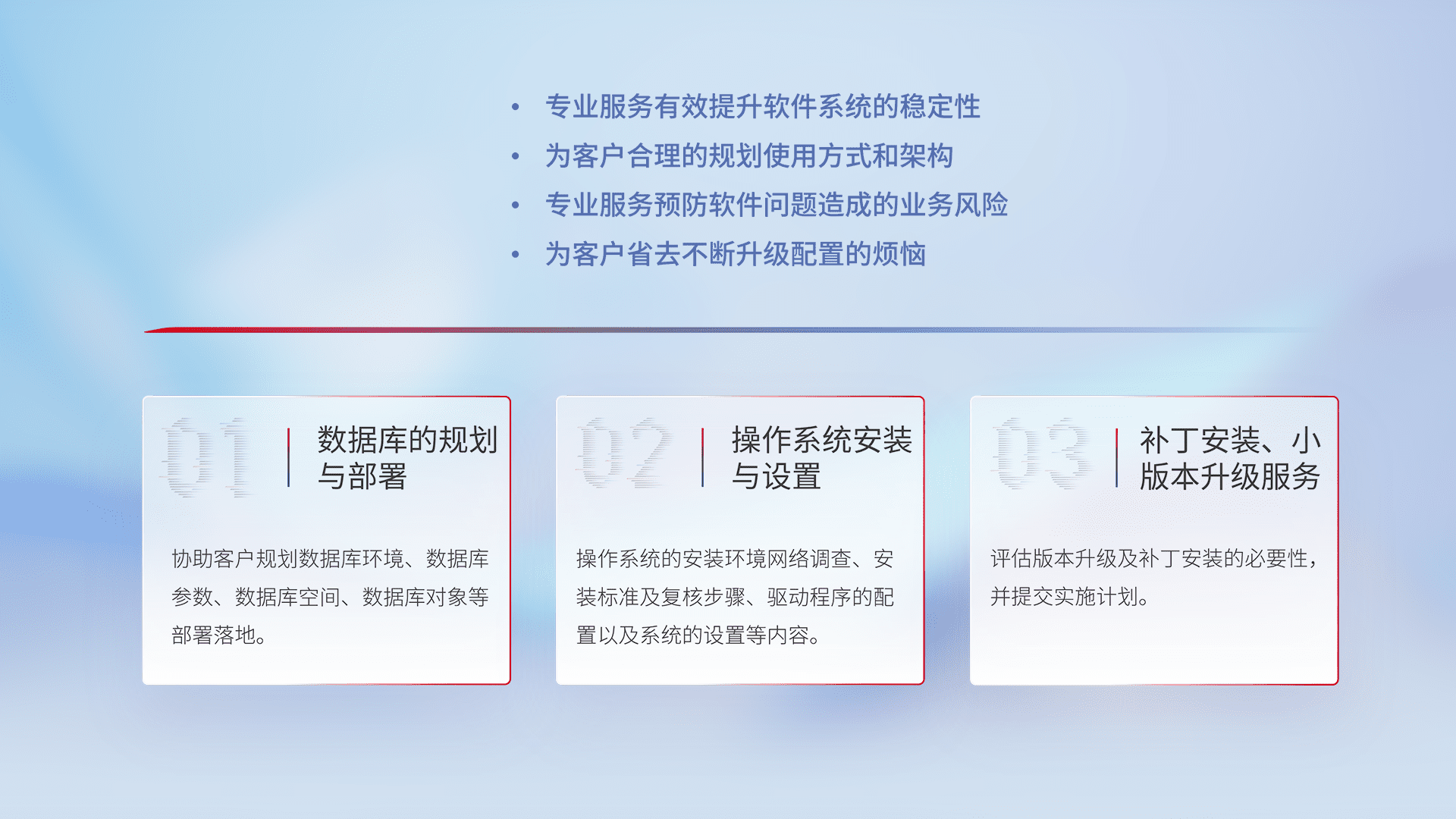 为客户提供软件规模升级、、、快速部署、、按需配置的专业服务,,,从数据库的规划与部署到操作系统的安装与设置,,,再到补丁安装和小版本升级提供支持。。。。